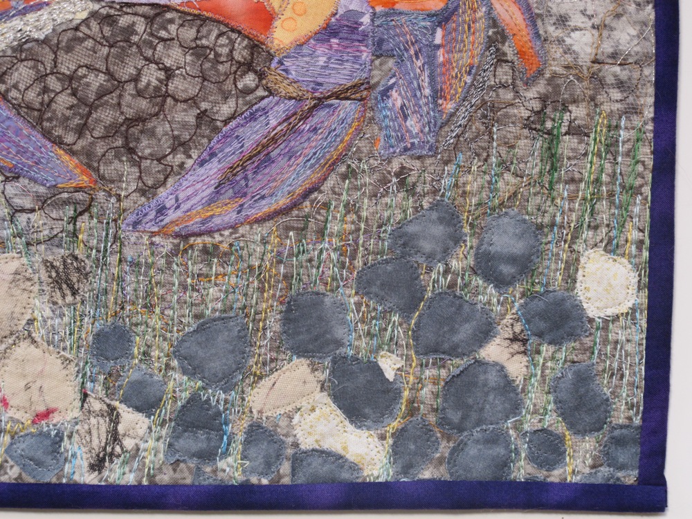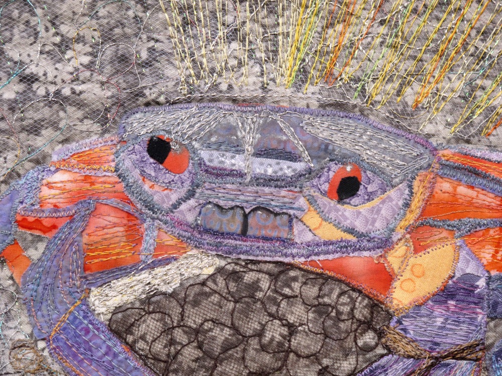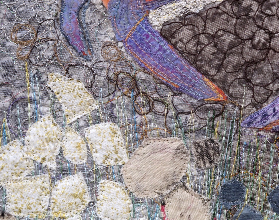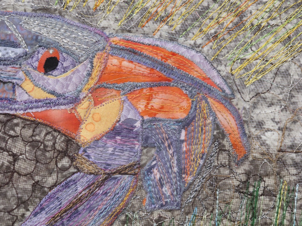 The second shot is after quilting. I chose not to do an enormous amount of thread painting, because I wanted the items in the fridge to be recognizable. They are not artistic images; they are bottles of juice, containers of milk and pots.